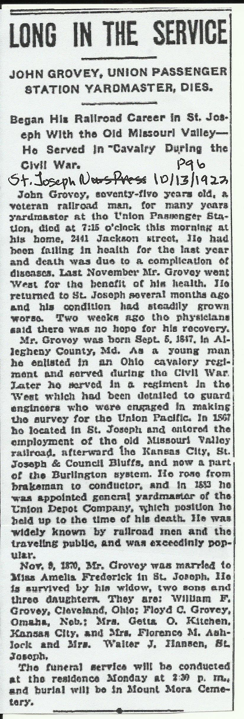 | Father of: Edward J Grovey, William F Grovey, Floyd C Grovey, Mrs. Gretta O Kithen, Mrs. Florence M Ashlock, Mrs. Caroline Emma Hansen |